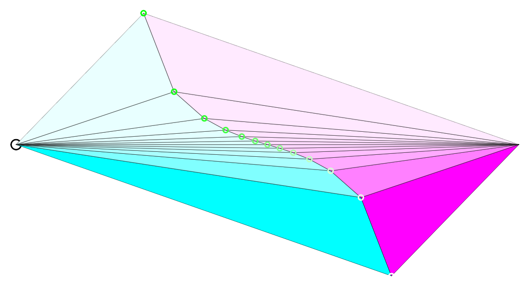 Some triangles that are gluing together to give part of a torus from a hyperbolic once-punctured torus bundle. A bunch of the triangles are similar. This picture is seen from infinity in hyperbolic 3-space.