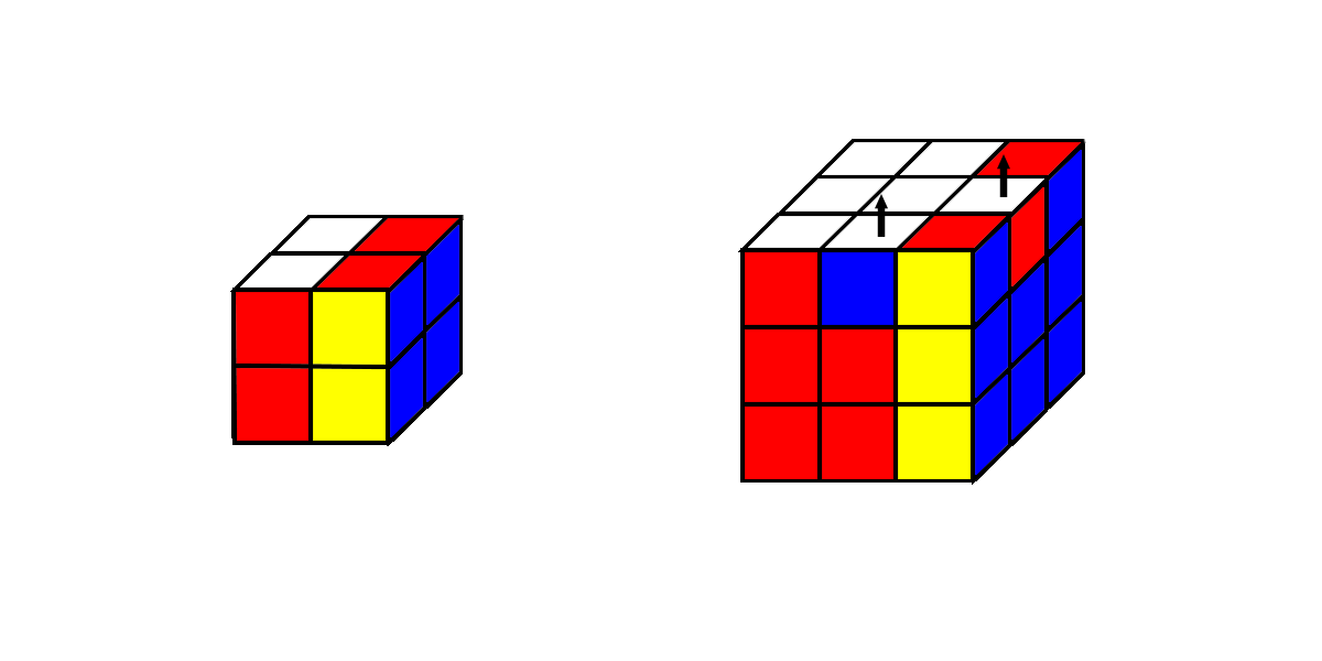 Did you know the 2x2 Rubik's Cube puzzle sits inside the 3x3 one? Here's a picture of how to send a move on the 2x2 cube to the 3x3 one.