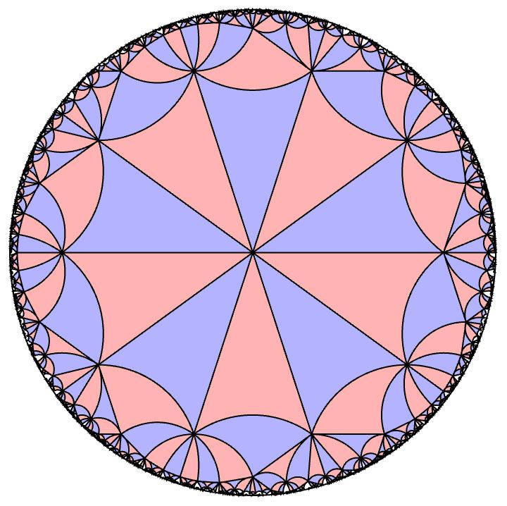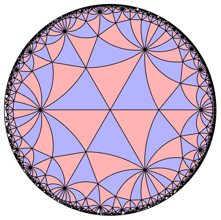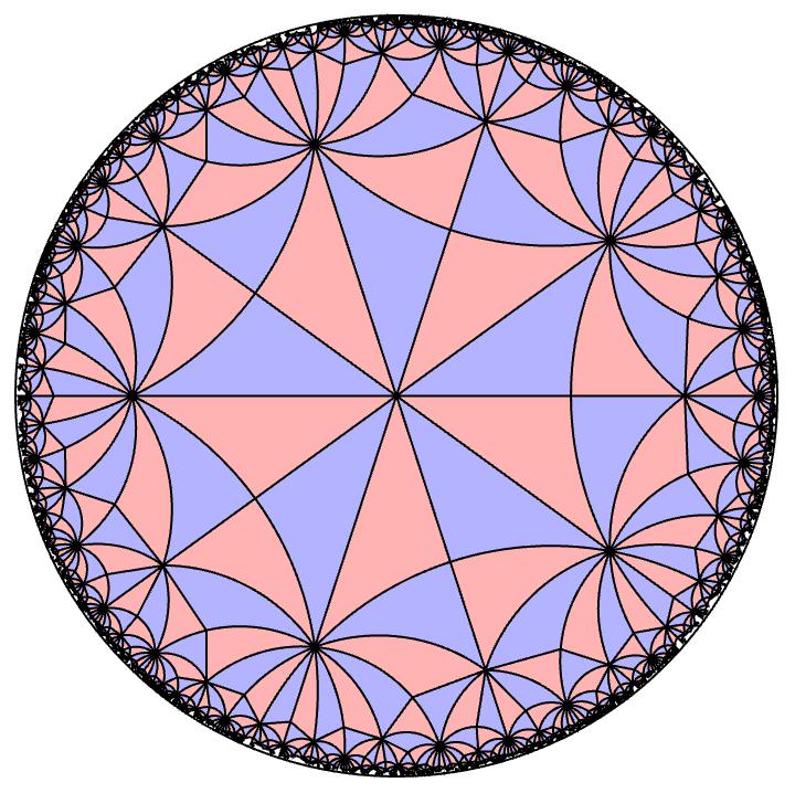 A picture of the (3,3,7) hyperbolic tiling. In the hyperbolic plane, all these triangles are the same area. These hyperbolic triangle have angles $\pi/3, \pi/3$ and $\pi/7$. In the hyperbolic plane, specifying these angles unqiuely determines the triangle up to isometry, unlike the Euclidean plane. The tiling is generated by taking that unique triangle and reflecting it about all three edges and going wild. The blue triangles are the ones you get from an even number of flips, and the pink triangles are the ones you get from an odd number of flips.