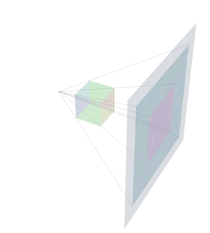 Here is a perspective projection of a rotating cube onto a plane. This projection can be imagined as like a movie theatre projection. The movie projector shoots out beams of light that hit the rotating cube and these light rays intersect the film screen.