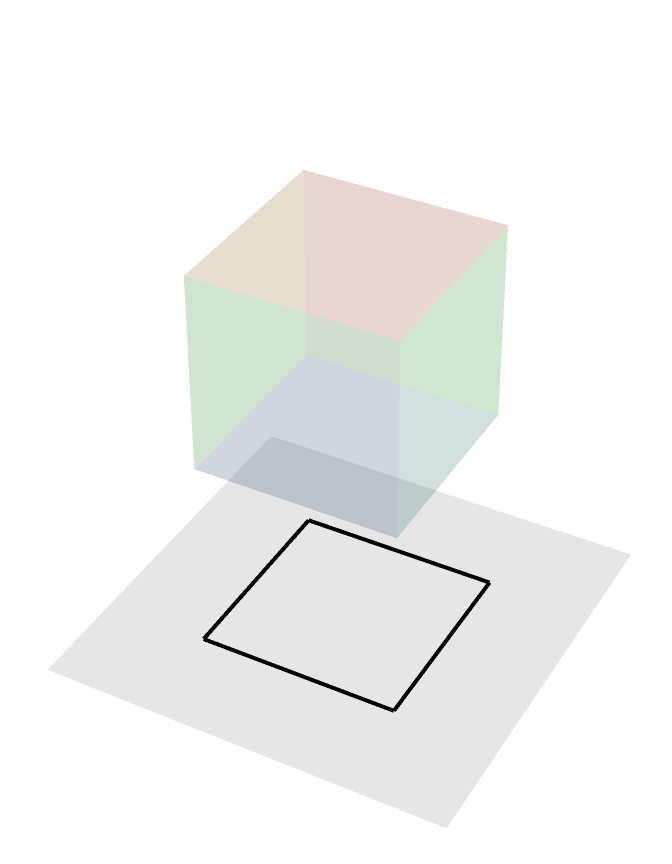 Here is a rotating cube in non-generic position being orthogonally projected onto a plane, non-generic here meaning that there are faces of this cube constantly being projected to lines in the plane. In particular, the two faces perpendicular to the axis of rotation are being projected to two black line segments.