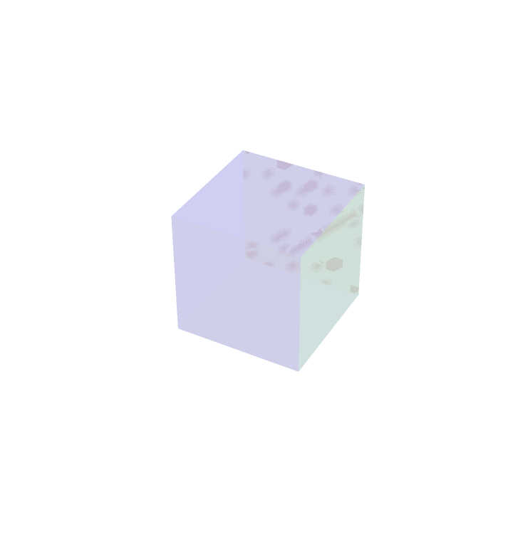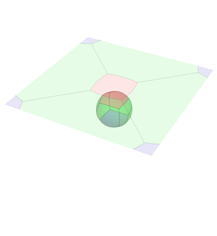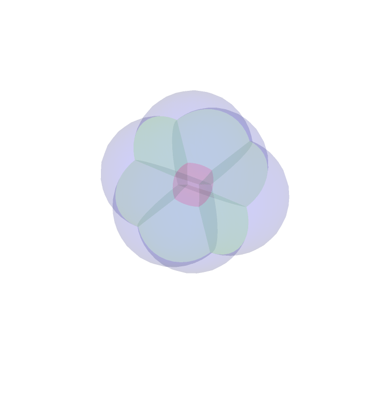 Similar to the stereographic projection above, we may project the faces of the rotating four dimensional cube onto the three sphere, and stereographically project. It is worth mentioning that the outer most `bubble' is actually projected to the complement of what you see. For instance, when the outside of this bubble blob is either entirely red or blue, the red or blue bubble is projected to the red or blue outer layer, but also everything lying outside and away from the bubble blob. This is to say that the image of the stereographic projection is all of space.