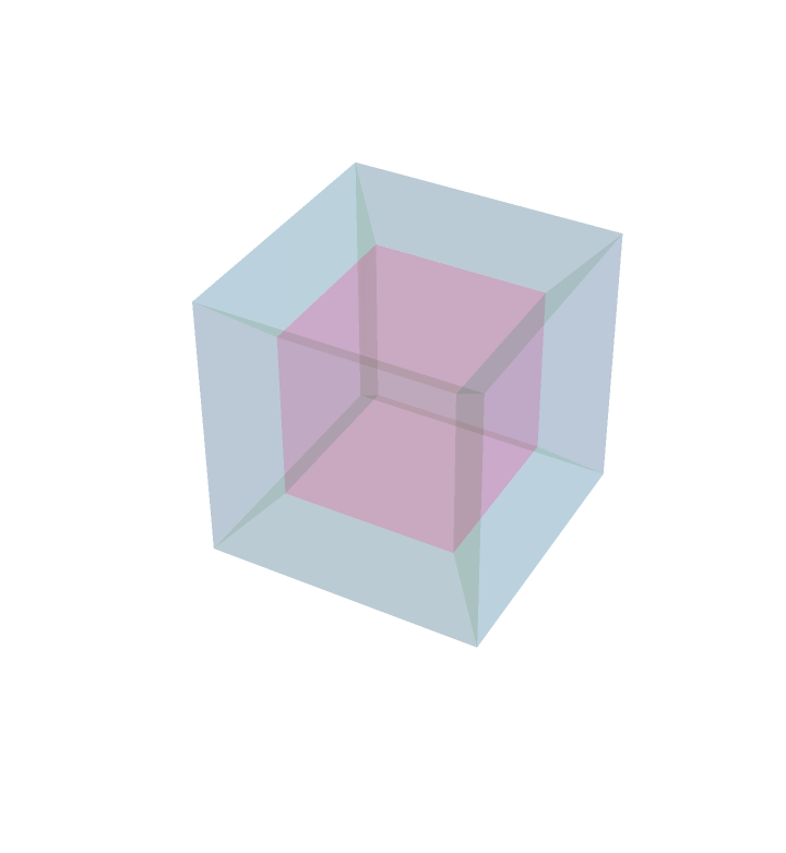 This is a perspective projection of a rotating four dimensional cube onto a three dimensional `screen.' Here it is a lot easier to see the eight three dimensional faces that make up the four dimensional cube. While it may seem as though the red cube sits inside the blue cube, or vice-versa, this is an illusion of the perspective projection. Compare this phenomenon to that of row one figure three above.