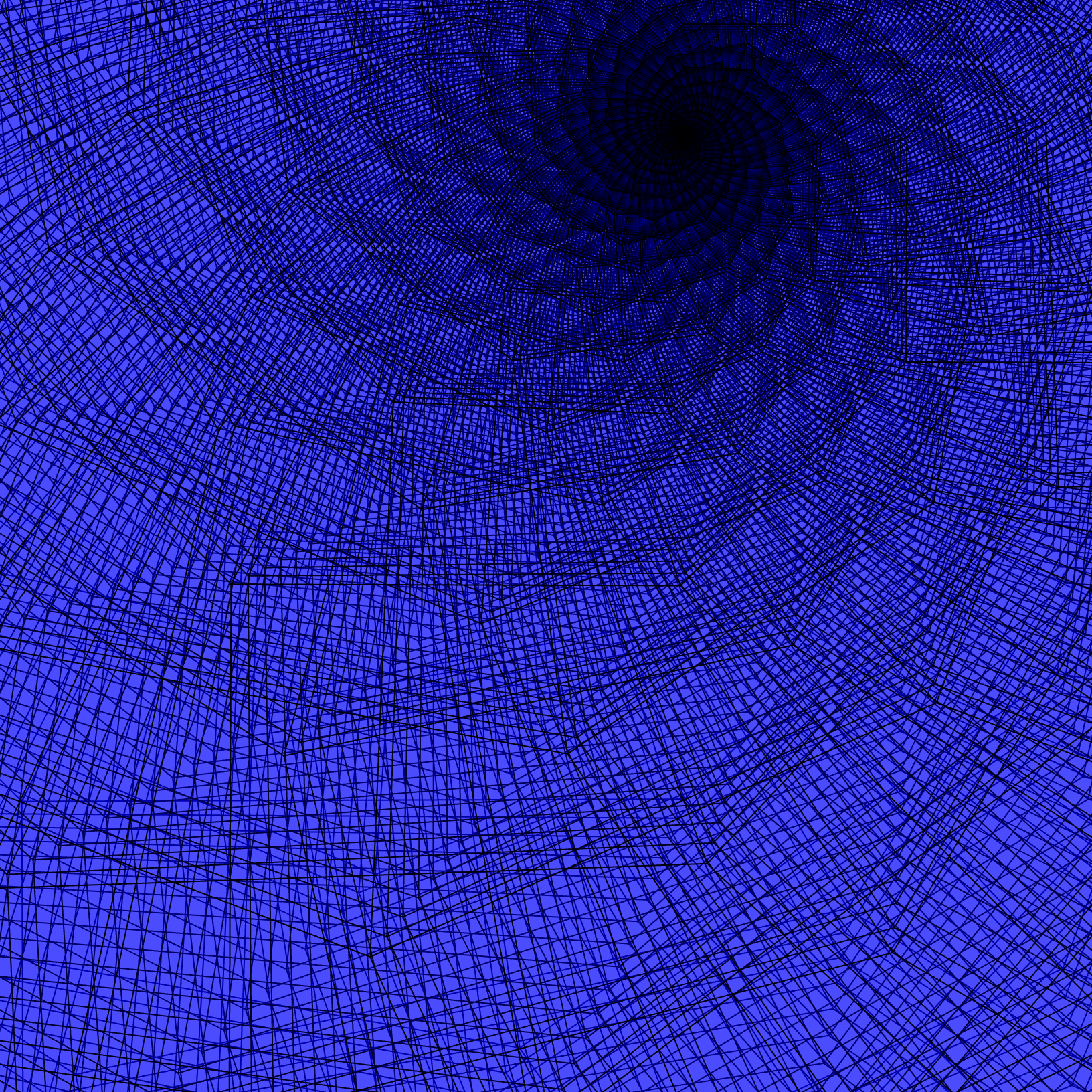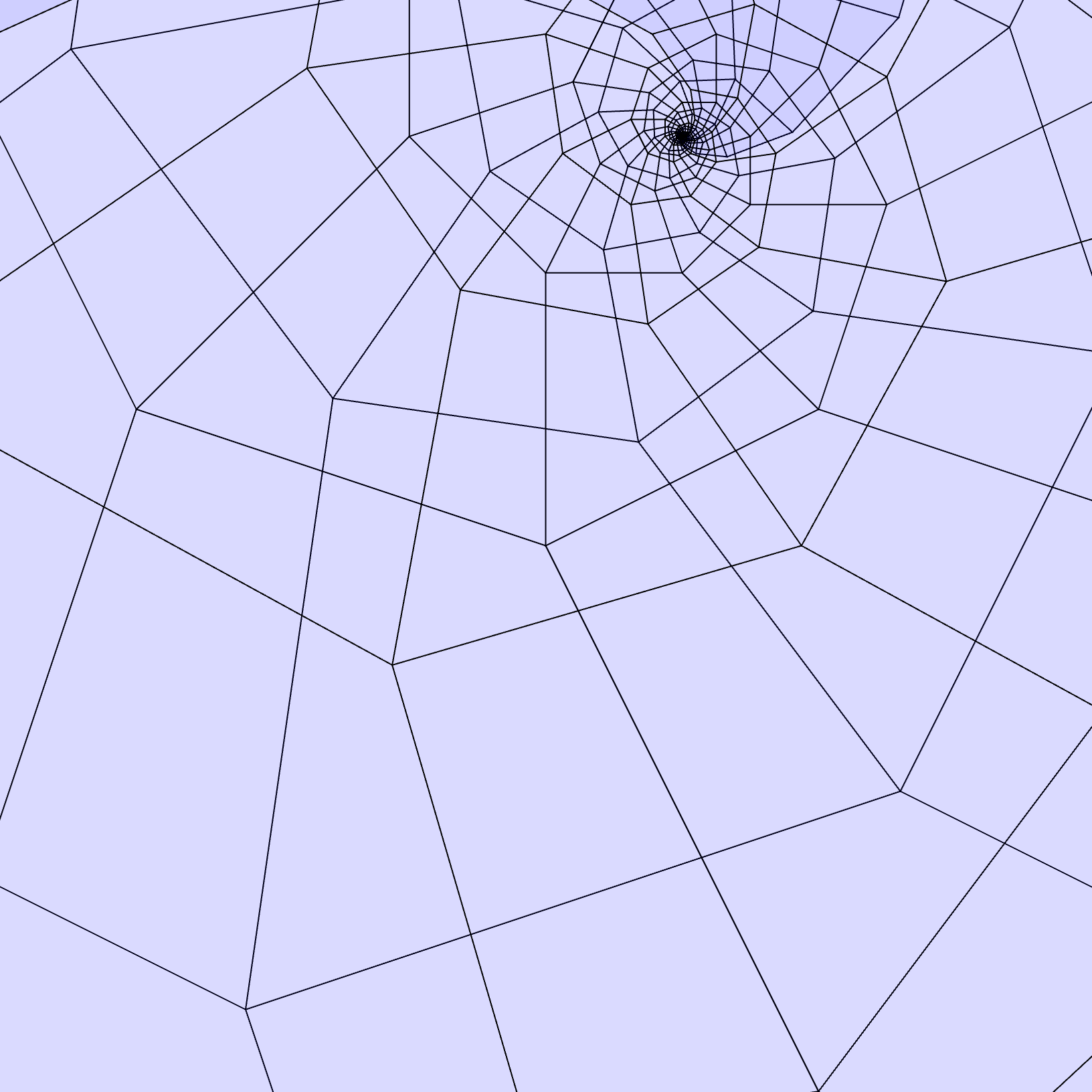 A picture of a the developing image of a similarity structure on a torus. This picture is obtained by taking a quadraliteral and gluing opposite edges by the corresponding similarity transformation. The image of the holonomy representation for this particular structure is indiscrete which amounts to the picture wrapping around on itself eventually. You can see it start to happen at about 1 o'clock near the `sun' to borrow a term of Thurston.